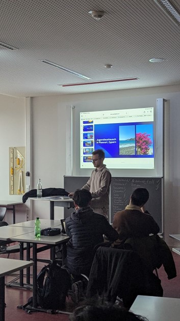 Due to the distance between Konstantin and the other members of our group, he hosted his own event to share his experiences from Pissouri. He used his connection to his former school near Frankfurt to implement four seminars for students from the age of 14 to 19. Altogether, 86 students participated. The 90 minutes each did not just include talking about the youth exchange, but also presenting all the Erasmus opportunities and sharing his experience of an Erasmus semester. Additionally, the event was equipped with information and discussions on the European Union itself, and was carried out with games and tasks for the students to reflect on their wishes to explore Europe themselves.