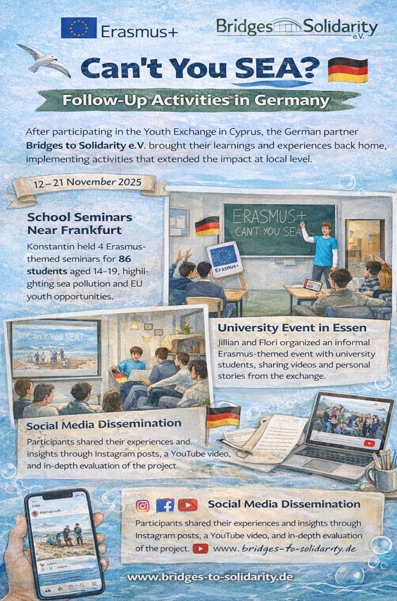 After the Erasmus+ Youth Exchange "Can't You SEA?", implemented in Pissouri, Cyprus from 12 to 21 November 2025, the German partner organization Bridges to Solidarity e.V. carried out a series of meaningful follow-up and dissemination activities aimed at transferring the project's results to local communities and inspiring further youth participation in European opportunities.